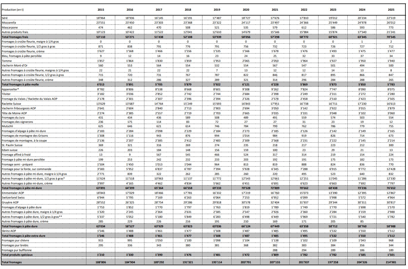 Il existe plus de 700 sortes de fromages suisses. En 2024, 214'981 tonnes de fromage ont été produites en Suisse. Cette quantité correspondant à 45 % de la production laitière suisse.